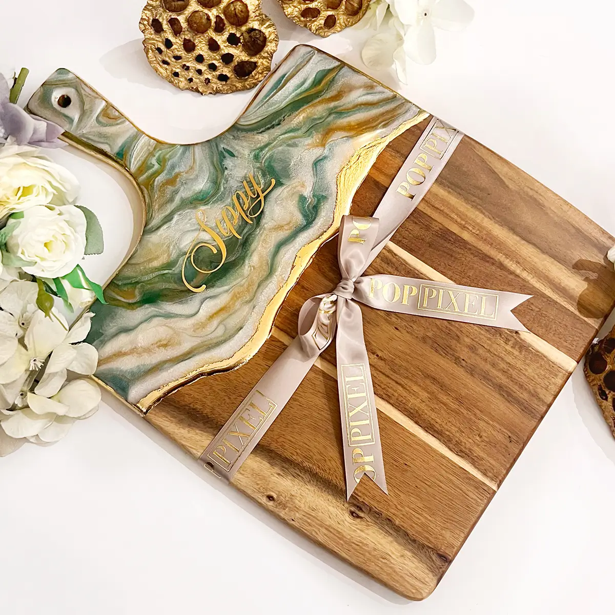 Impress your guests with this stunning, one-of-a-kind personalized cheese board. Each board is meticulously handcrafted, featuring a unique marbled resin design that makes it a functional piece of art. Perfect for serving cheeses, charcuterie, appetizers, or desserts, this board adds a touch of elegance to any occasion.