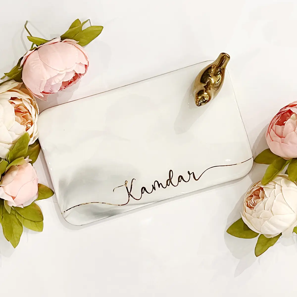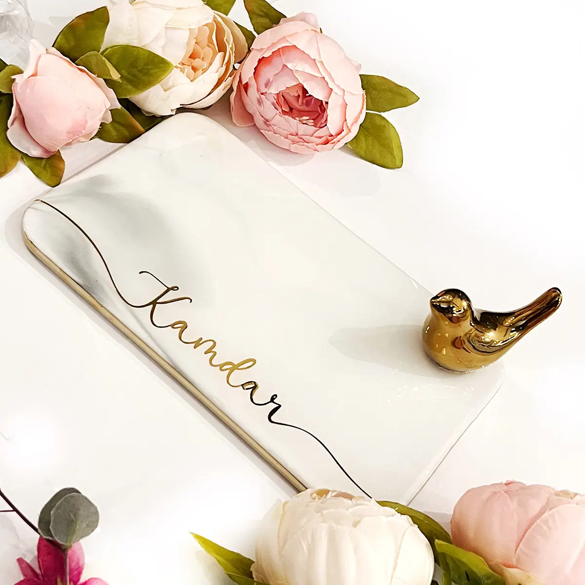 Elevate your tablescape with our Bird Platter, a masterpiece of timeless luxury. Crafted from smooth, high-quality porcelain with a grey and white marble design and a lustrous gold trim, this exquisite serving piece is adorned with a delicate gold bird motif in the top left corner, symbolizing grace and freedom. Personalized with a name or special message in elegant cursive script, it transforms every gathering into a cherished occasion.
