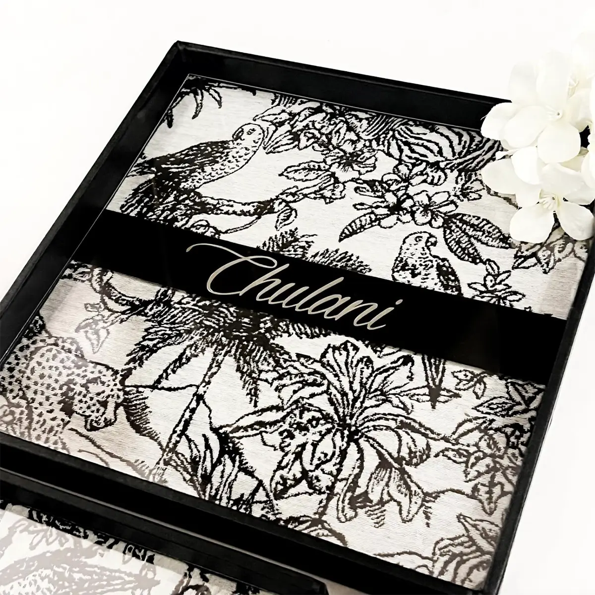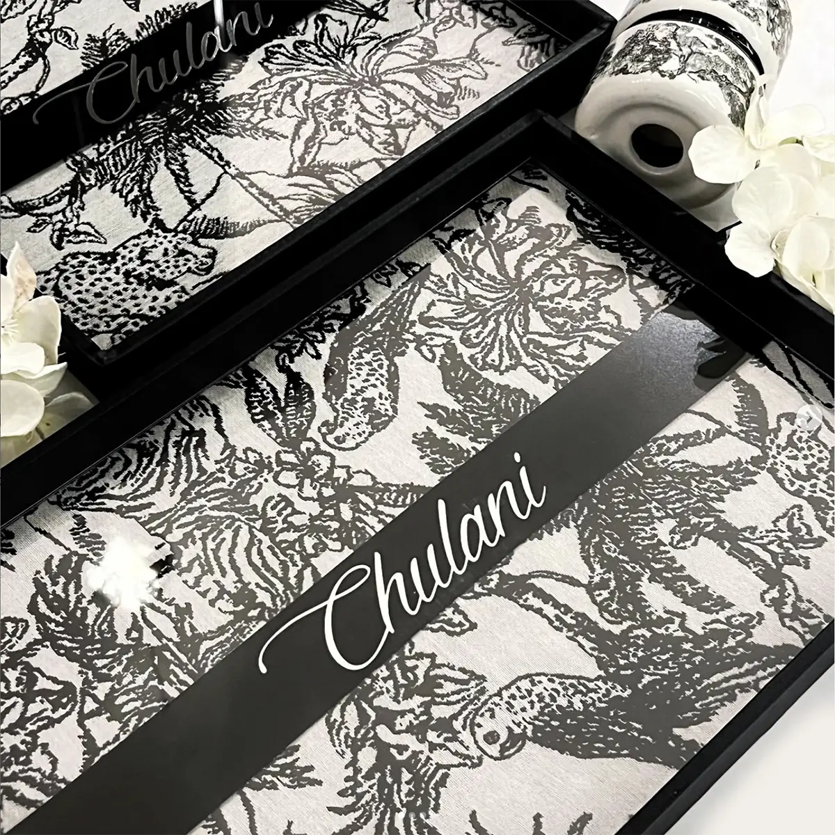 Introducing our stunning set of two personalized trays, perfect for adding a touch of elegance to any room. Each tray is beautifully designed with an intricate botanical pattern, featuring exotic flora and fauna that will enhance your home decor.