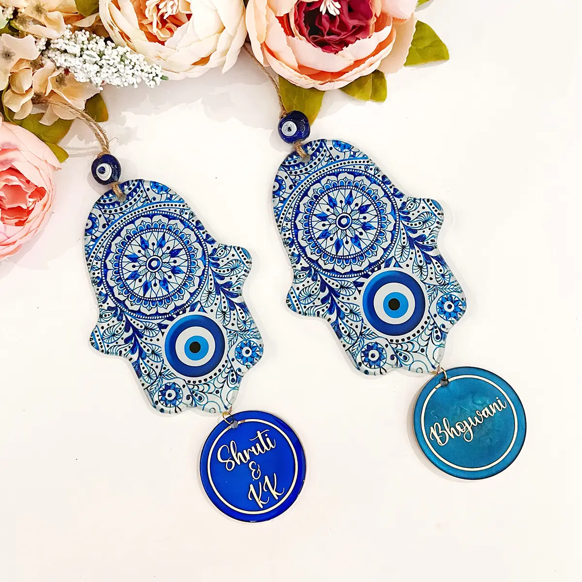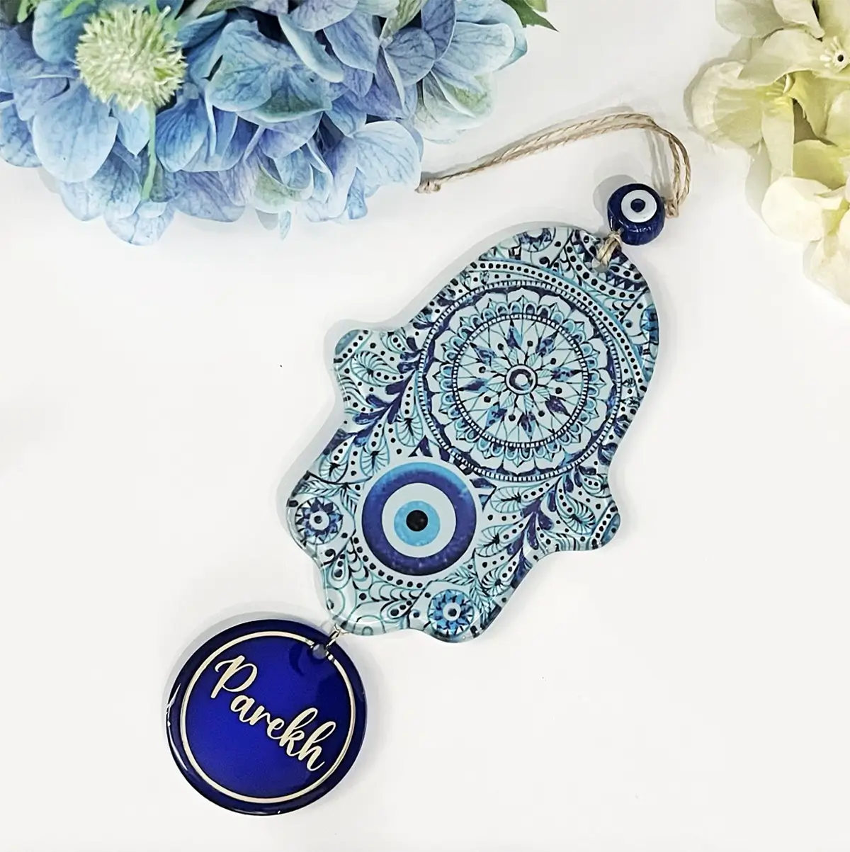 Introducing our charming Personalized Hamsa Hand Wall Hanging, a stunning piece that beautifully combines tradition and artistry. Featuring and intricately designed hamsa hands in vibrant blue, this wall hanging is perfect for fostering a positive atmosphere in any space.