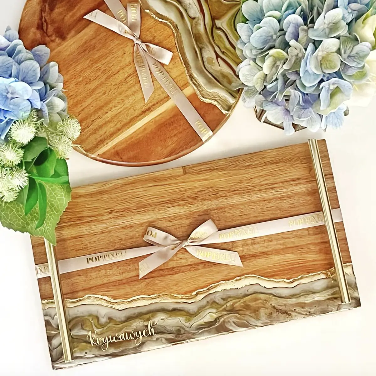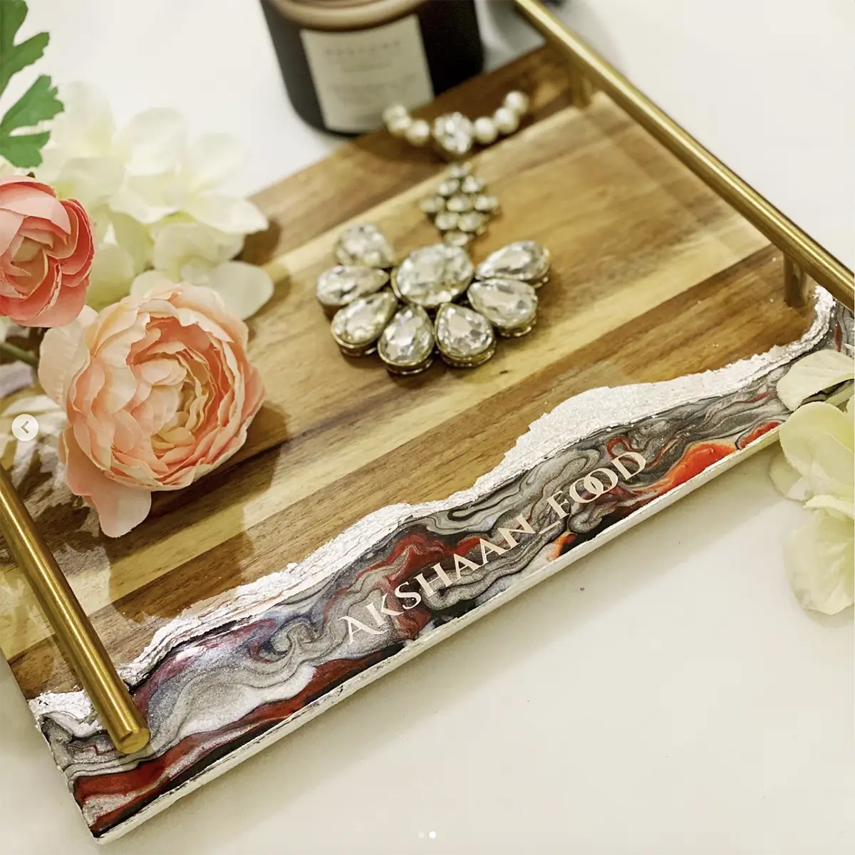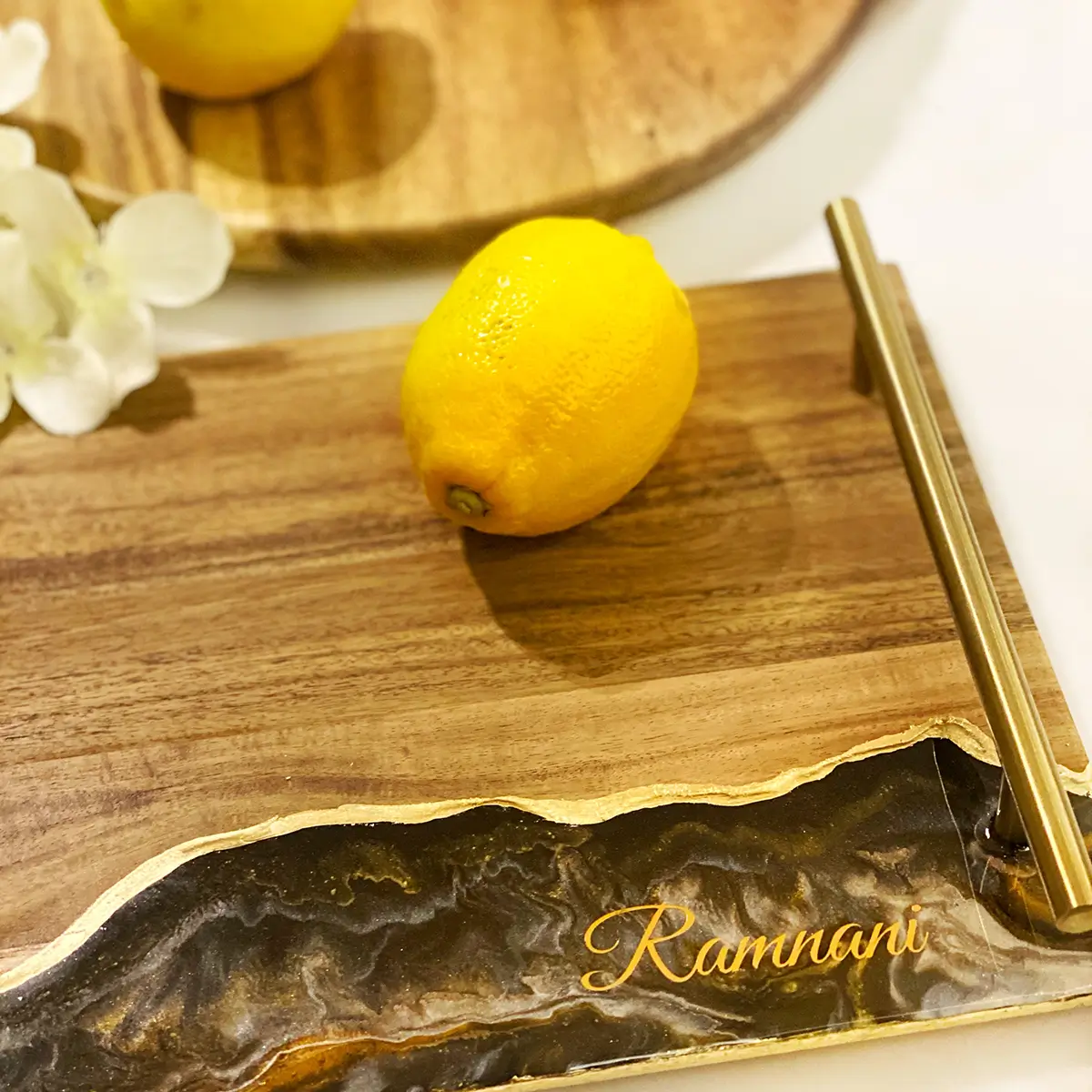 Transform your serving style with our exquisite collection of wooden trays featuring a stunning handmade resin marbled design. Each tray is beautifully personalized in the bottom right corner, making it a perfect addition to your home or a thoughtful gift for loved ones.