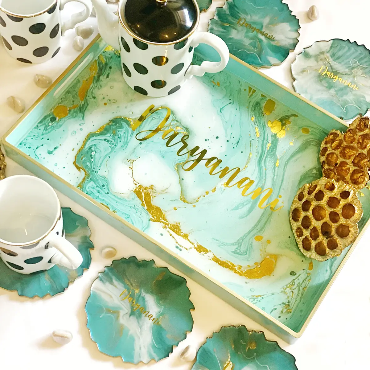 Enhance your home decor with our exquisite rectangular personalized tray, designed to be both functional and stylish. Featuring a stunning marble design in rich tones of Turquoise and White, this tray is the perfect statement piece for any setting.