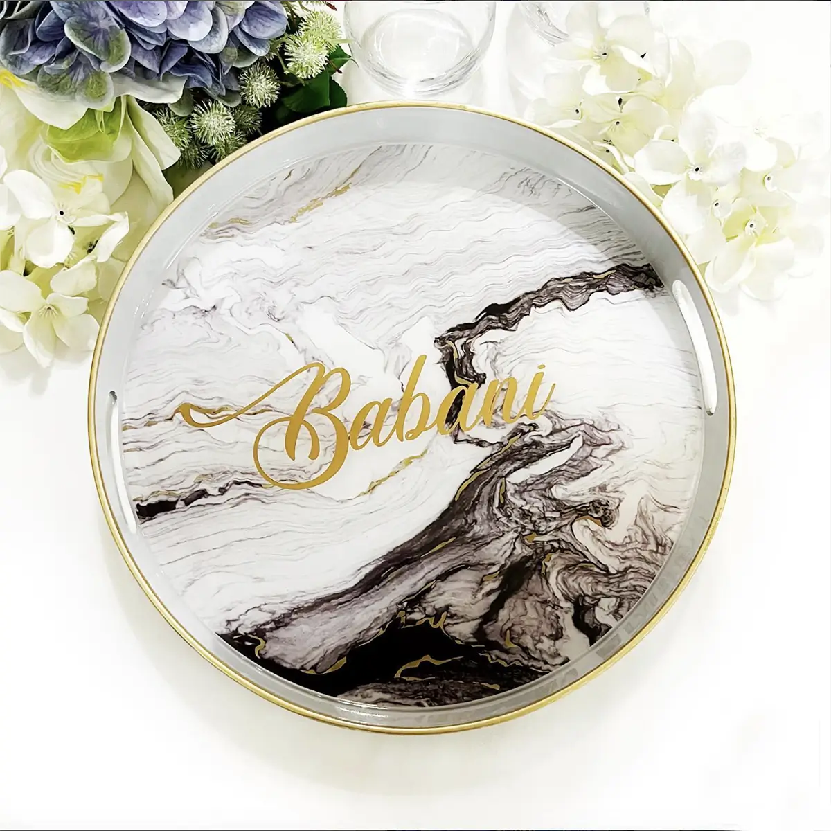 Enhance your home decor with our exquisite circular personalized tray, designed to be both functional and stylish. Featuring a stunning marble design in rich tones of black and white, this tray is the perfect statement piece for any setting.